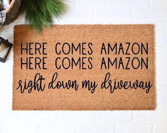 Amazon Com Warm Doormat Here Comes Amazon Right Down My Driveway Door Mat With Rubber Backing Home Decor Indoor Mats For Entry Front Floor Mats 23 6 X 15 7 Inches Kitchen Dining