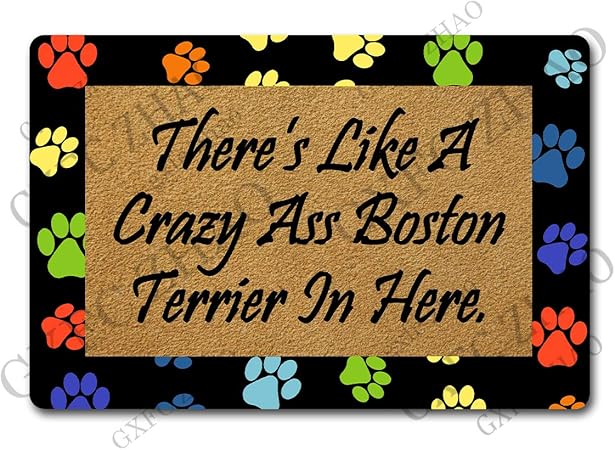 Amazon Com Funny Welcome Door Mats Decorative Area Rugs For Entrance Way Indoor Doormat Personalized Novelty Gift Mat 23 7 X 15 9 In There S Like A Crazy Ass Boston Terrier In Here Kitchen Dining